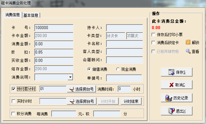 适用于美容、美发、酒店、商场(可打折、计次、预计时、实时计时、积分、积分兑换等多种会员消费方式)等行业的磁卡消费管理的软件(内含预计时消费模块及实时计时消费模块,更适合计时消费的娱乐场所,同时系统中集成了会员积分管理,会员可积分、可积分兑换)。后台使用ACCESS小型数据库和SQL大型数据库。