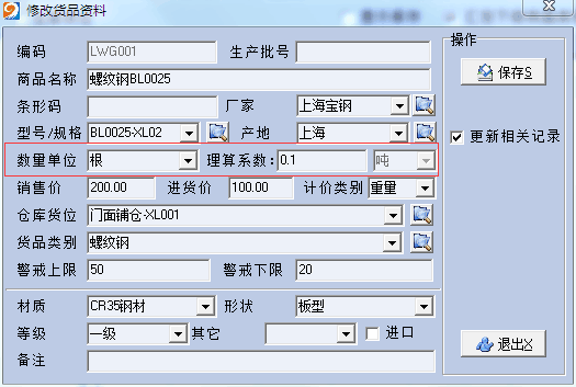 5.可以对不同的钢材采用不同的计量单位,如:米、根、件、吨、张等,并可自动换算成理论吨数.