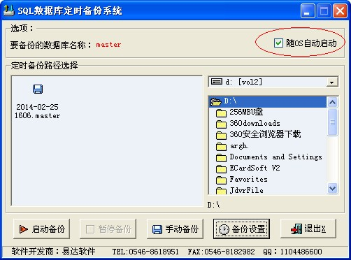 1. 易达sql定时备份可选择手动备份以及定时备份,打开此软件,点击软件右上角,将“随OS自动启动”前的对勾选择上。