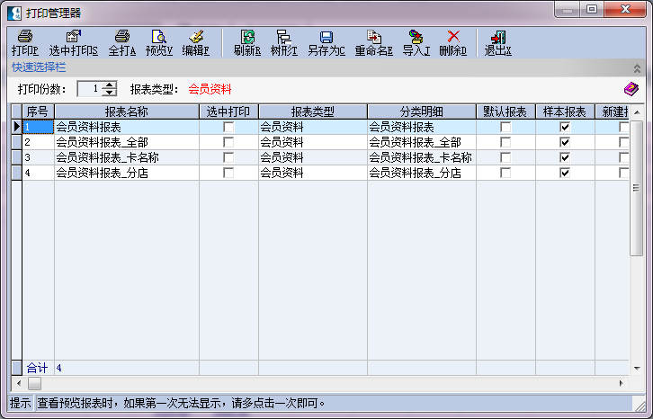 所有单据支持报表自定义打印格式,报表打印管理支持编辑、预览、打印、删除、编辑、另存、引入等功能。