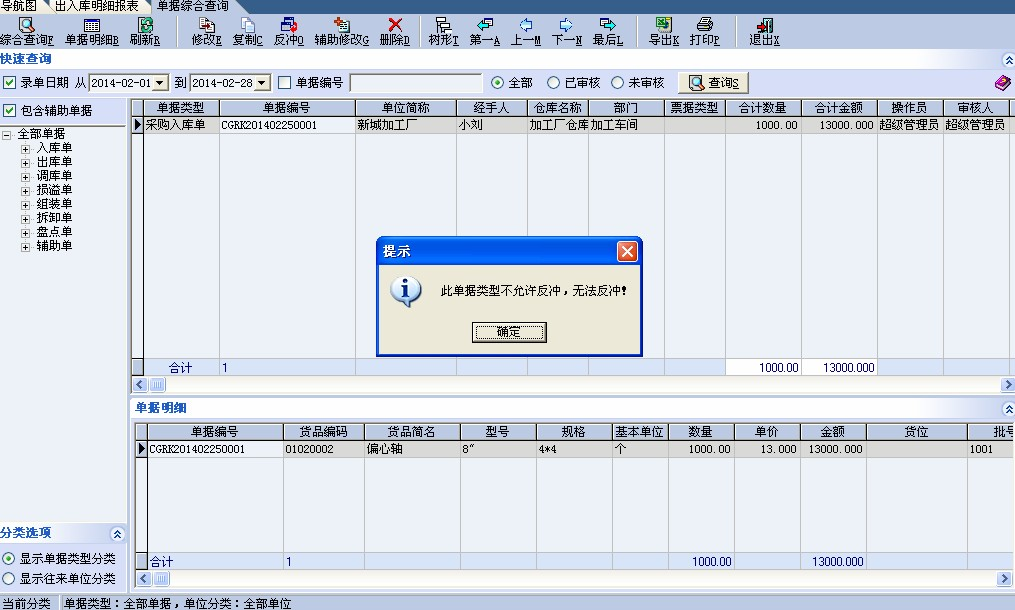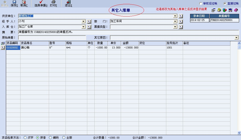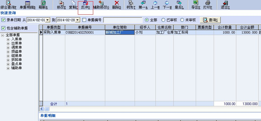 针对这样的情况,仓管王V8000中,特别增加了反冲这项功能。使单据产生一个与原单据完全一致的,只是金额和数量均为原来的负数的单据,平衡好库存金额后,再进行正式单据的录入。这样更好地解决了对库存平均价的影响问题。