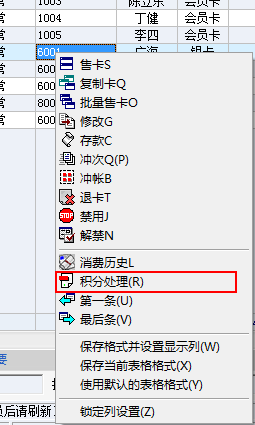 在会员管理窗口中。右击该卡,有一个积分处理。