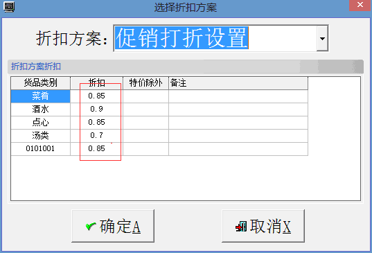在优惠促销时段中设置了折扣方案时段,则仅能在促销时段才能使用折扣方案,如优惠促销时间段中没有设置时间,则全时段使用折扣方案设置。