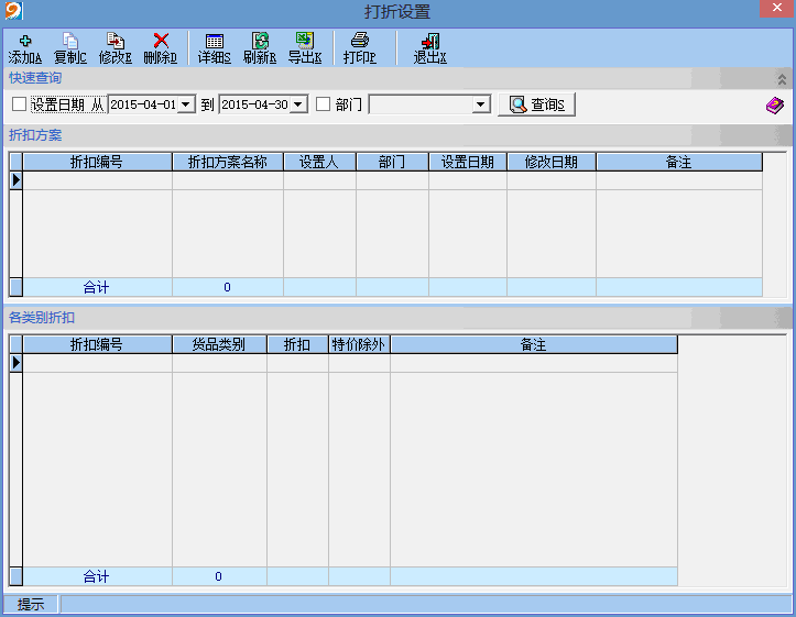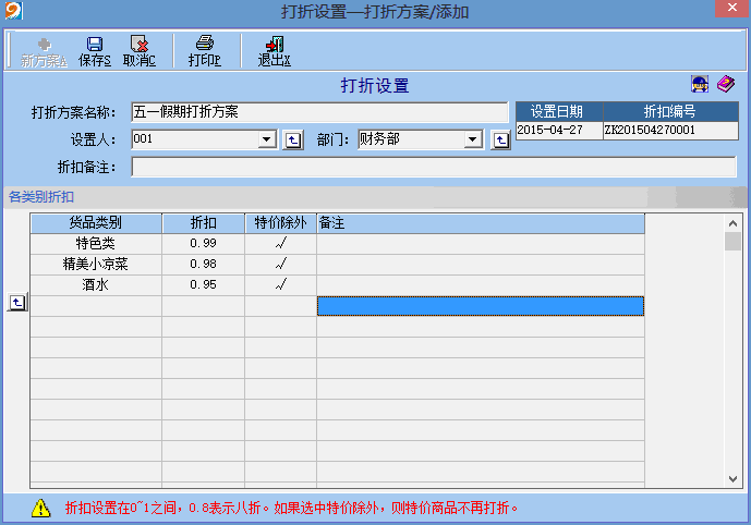折扣方案是对商家促销可设置的折扣方式。在折扣方案中,用户可将某类的商品进行统一的类别可享折扣。以及该促销方案,实施的时间来进行设置。
