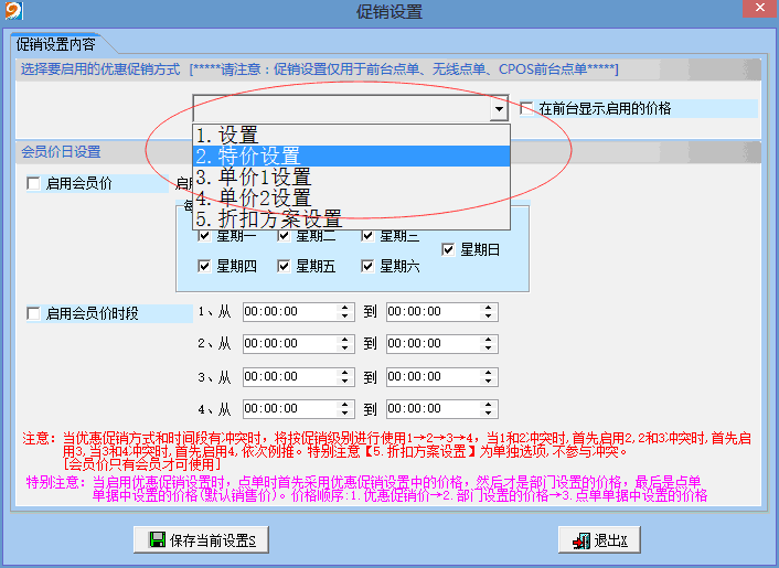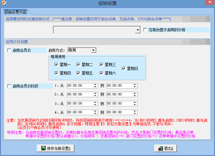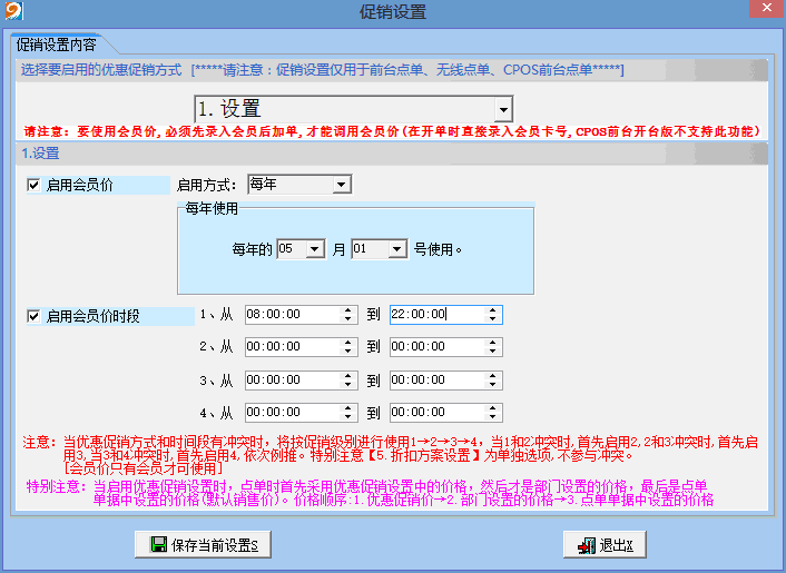 注:当优惠促销方式与时间段有冲突时,将按促销级别进行使用1→2→3→4,当1和2冲突时,首先启用2,2和3冲突时,首先启用3,当3和4冲突时,首先启用4,依次类推。特别注意[5.折扣方案设置]为单独选项,不参与冲突。