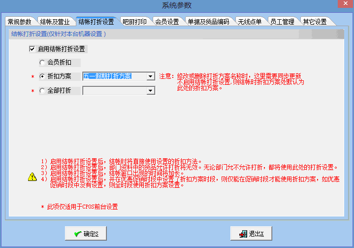 如果选择折扣方案设置的话,注意,如果不启用结账折扣方案时段,则结账折扣方案为全时段使用(需要系统参数中设置使用)。