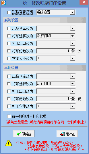 在后台,点击基础资料——货品资料,打开货品资料窗口,点击“统一修改”,可以看到统一修改吧厨打印设置和修改打印设置。