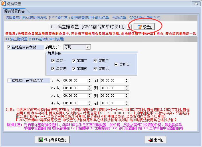 2.设置好促销的日期时间后,点击保存当前设置按钮后,点击右上角的:设置按钮如下图: