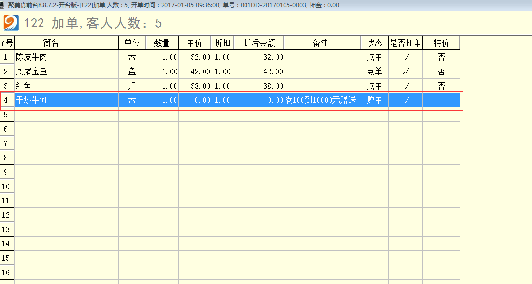 4.在聚美食前台点单时到达满立赠规则金额后,会自动赠送相应货品如下图: