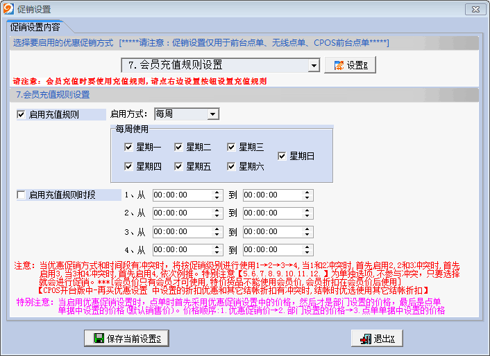 2.设置好启用的日期时间后,点击“保存当前设置”,并点击右侧的“设置”按钮进入充值规则设置窗口如下图:
