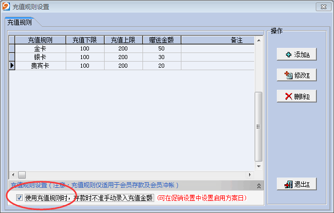 开启使用充值规则,并添加相应充值规则应用。