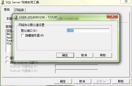2.然后选择TCP/IP,点击属性 ,设置端口号(一般默认为1433),切记不要隐藏服务器.如下图: