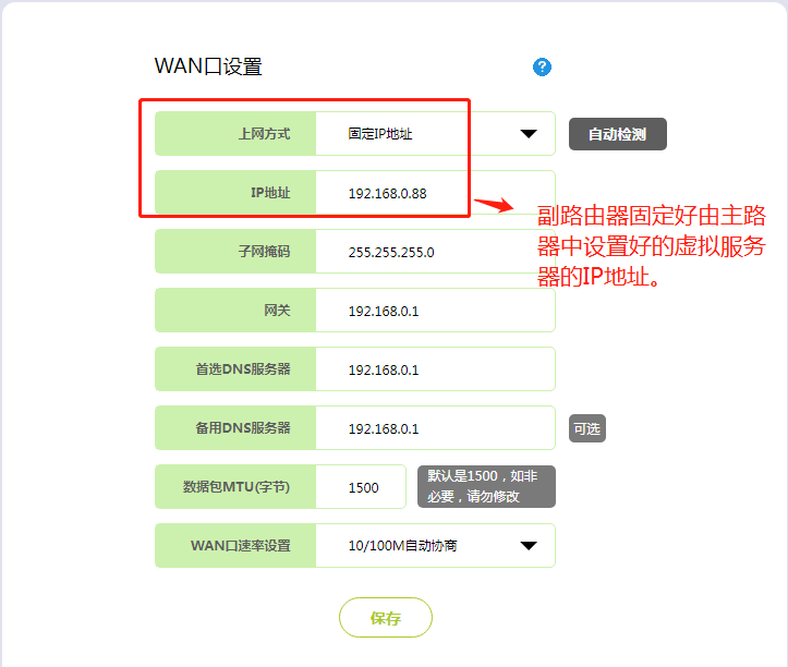 2.在服务器端进入副路由器,副路由器上网方式设置成固定主路由器设置的转发IP地址,如下图: